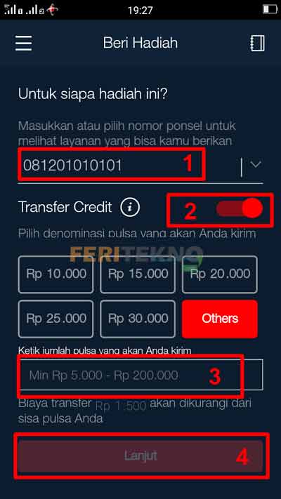 4. Lalu kau masukkan nomor tujuan yang saya beri tanda nomor 1, kemudian aktifkan tombolnya yang saya beri nomor 2, kemudian isi nominal pulsa yang mau ditransfer yang saya beri nomor 3, kemudian tinggal klik tombol Lanjut untuk mengirimnya.